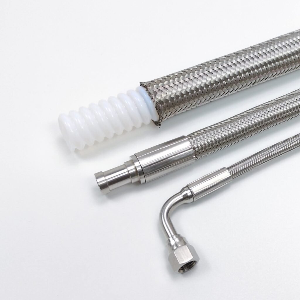 PTFE (Teflon) hose assemblies are flexible hoses made from Polytetrafluoroethylene (PTFE), a synthetic fluoropolymer known for its exceptional chemical resistance, low friction, and high-temperature tolerance. These assemblies consist of the PTFE hose itself and fittings that connect it to other parts of a system, like valves or pumps. The fittings are crucial for a secure and leak-proof connection, ensuring the hose can handle the intended application.